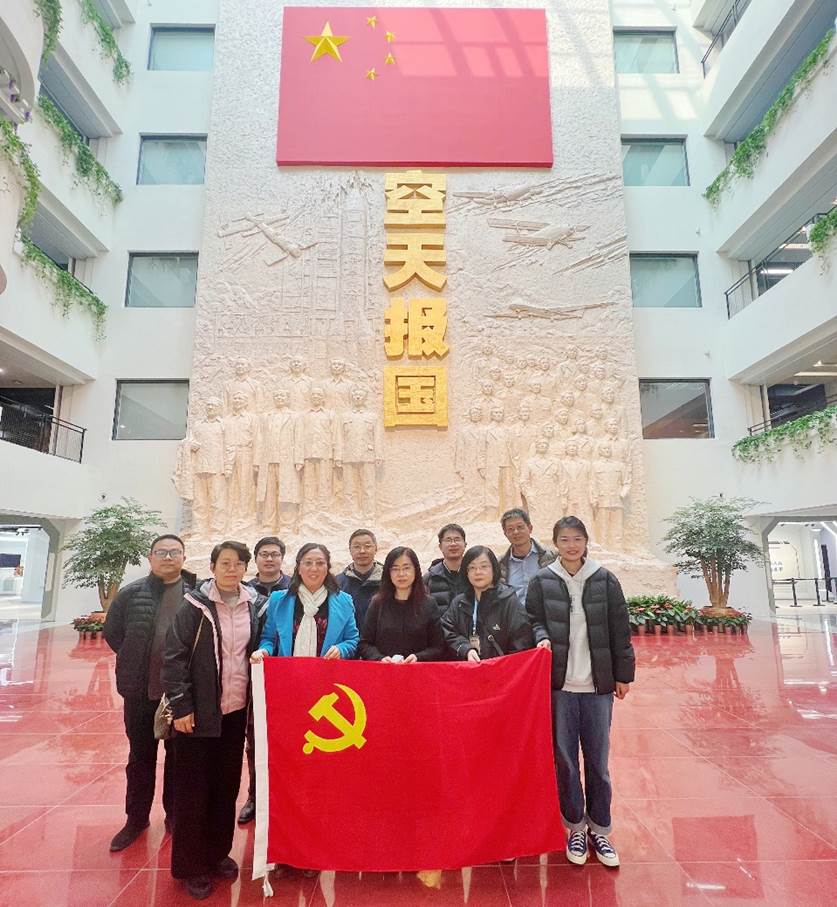 党支部在一楼大厅“空天报国”主题雕塑前合影