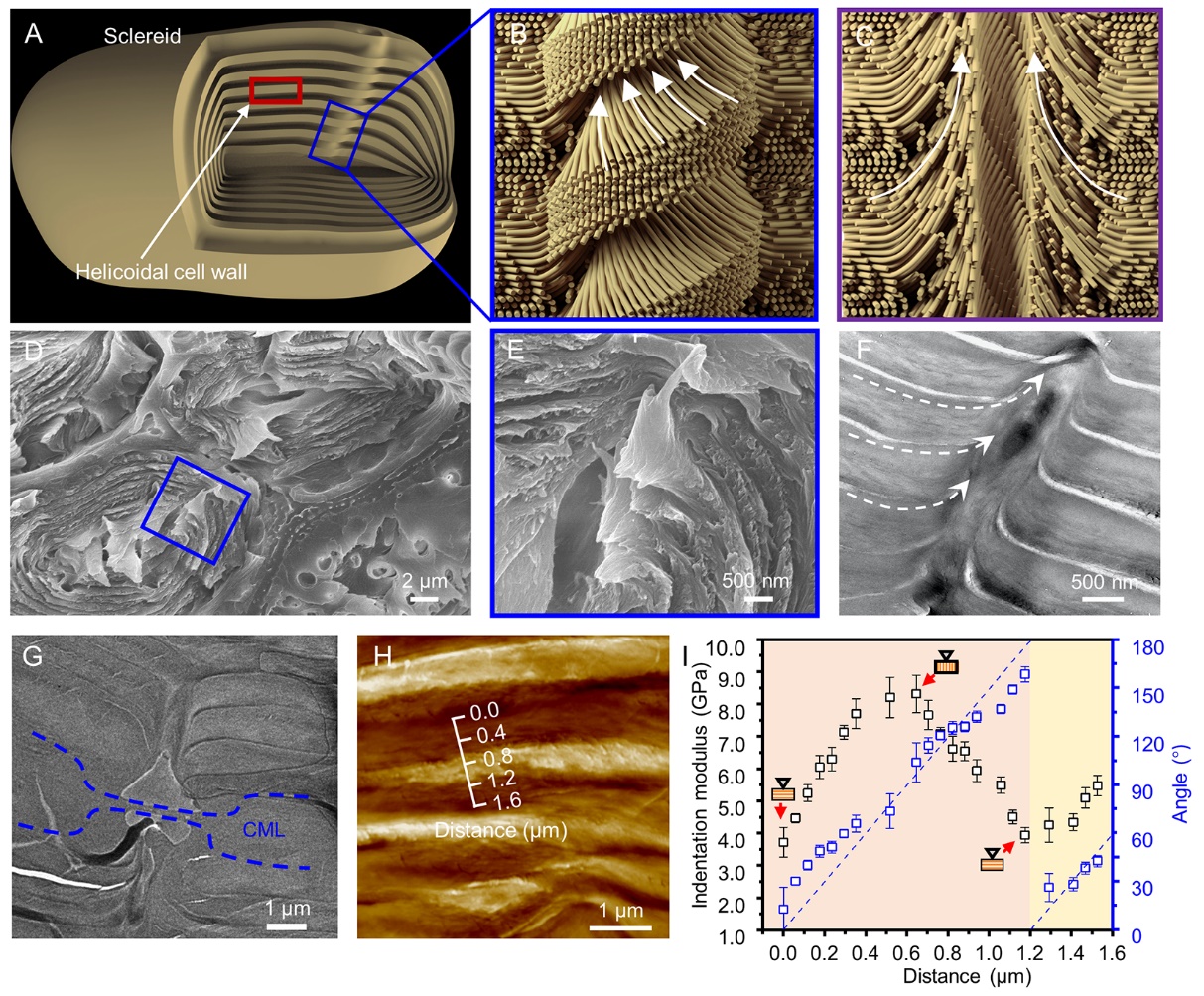 图 2. (A)石细胞示意图。(B)嵌入细胞壁并穿过胞间层的“纹孔对”示意图。(C) “纹孔对”的纵向剖面示意图。(D和E)SEM照片显示像“螺钉”一样钻到细胞壁上的纹孔。(F)纹孔的TEM照片显示纤维素微纤维沿着纹孔缠绕。(G)“纹孔对”的TEM照片。(H)石细胞横截面的AFM照片和(I)微纤维角度对压痕模量的影响。