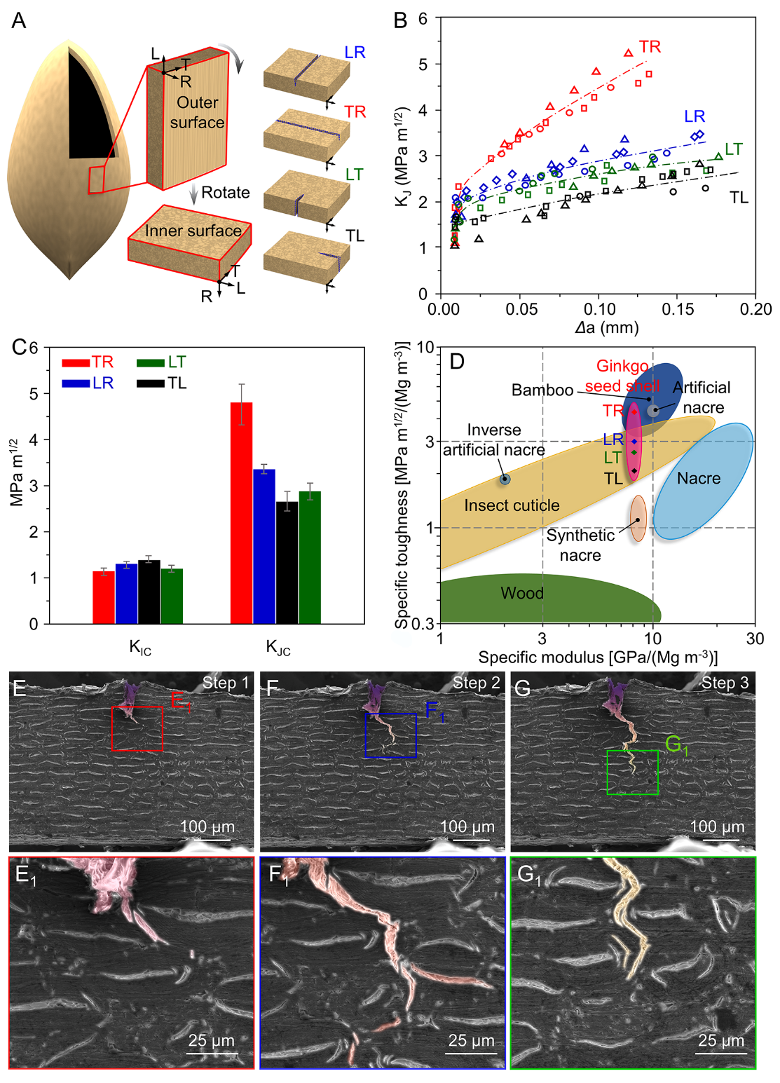 图 3.(A)银杏果壳中裂纹扩展的四个方向;(B)银杏果壳四个方向的不同裂纹扩展长度(Δa)对应下的KJ(KJ为裂纹扩展过程中,基于J积分的强度因子);(C)银杏果壳四个方向的KIC和KJC;(D)银杏果壳和其他天然及人造壳类材料的比韧性-比模量比较图。裂纹扩展过程(E、F、G)及其对应的裂纹尖端高倍SEM照片(E1、F1、G1)。