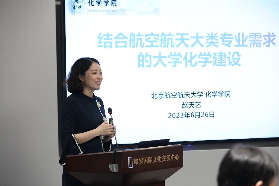 最后,北航诸侯快讯官网登录院长助理赵天艺以“结合航空航天大类专业需求的大学化学建设”为主题展开报告。报告就北航诸侯快讯官网登录所开设的大学化学课程基本情况、师资力量、建设成果等内容总体介绍了该课程建设现状,并结合空天特色,针对不同学生专业背景,提出“因材施教”的大学化学课程建设目标。同时,也对大学化学课程建设中面临的如何在有限学时内结合各专业所需,有效发挥化学基础学科的作用等问题,提出了大学化学课程建设的改革思路和举措。