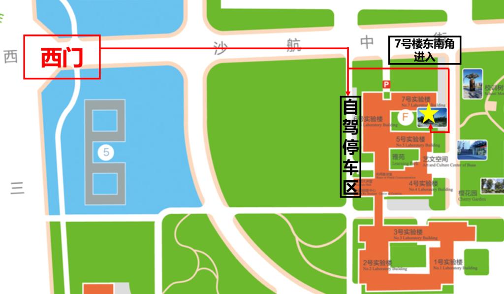 沙河校区进校路线、停车区及进入楼宇入门登记处详见下图。