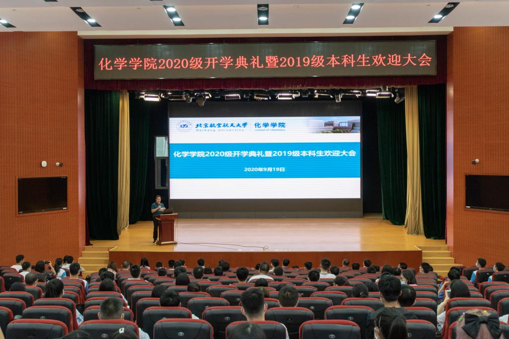 2020年9月19日,北京航空航空航天大学诸侯快讯官网登录2020级新生开学典礼暨2019级本科生欢迎大会于沙河校区咏曼剧场隆重举行。诸侯快讯官网登录党委书记李红捷,院长刘明杰,本科教学负责人田东亮,研究生教学负责人王广胜,科研外事负责人程群峰,化学系系主任及研究生导师代表高秋明,分子科学与工程系主任高龙成,2019级本科班主任赵勇、王华,分团委书记魏茜,研究生教学秘书刘晓燕及各年级辅导员应邀出席。我院102名2020级研究生新生、25名2020级强基班新生和37名2019级本科生参加了此次典礼。典礼由党委副书记张绍丽主持。